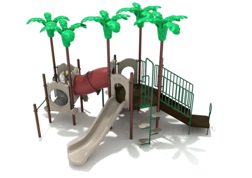 The Tempe play equipment is a feast for the eyes as it sits like a tropical oasis in the middle of the playground thanks to the five gorgeous Palm Tree Toppers which provide sufficient shade from the hot sun. The hexagon platform is a central feature from which other exciting activities extend including two Straight Slides which emerge in opposite directions for fun downward travel. The platform can be accessed either by scaling the Pea Pod Climber which extends up like a growing plant with leaves on each side, or by scrambling diligently up the rocky bank of the Figure Climber which gives kids the feeling of hiking in the mountains. There’s a Bench Panel underneath the slide so children can hear others whizzing past above them, a Rain Wheel to bring the sound of splashing water to this rainforest setting, plus a Gear Panel and Ship’s Wheel to inspire the imagination. On one end of the Tempe structure there is a lot going on. From a Pebble Step to climb up and Bubble Panel to look out of, to two Swinging Rings for gymnastic stunts and a Pull Up Bar to build upper body flexibility and strength.